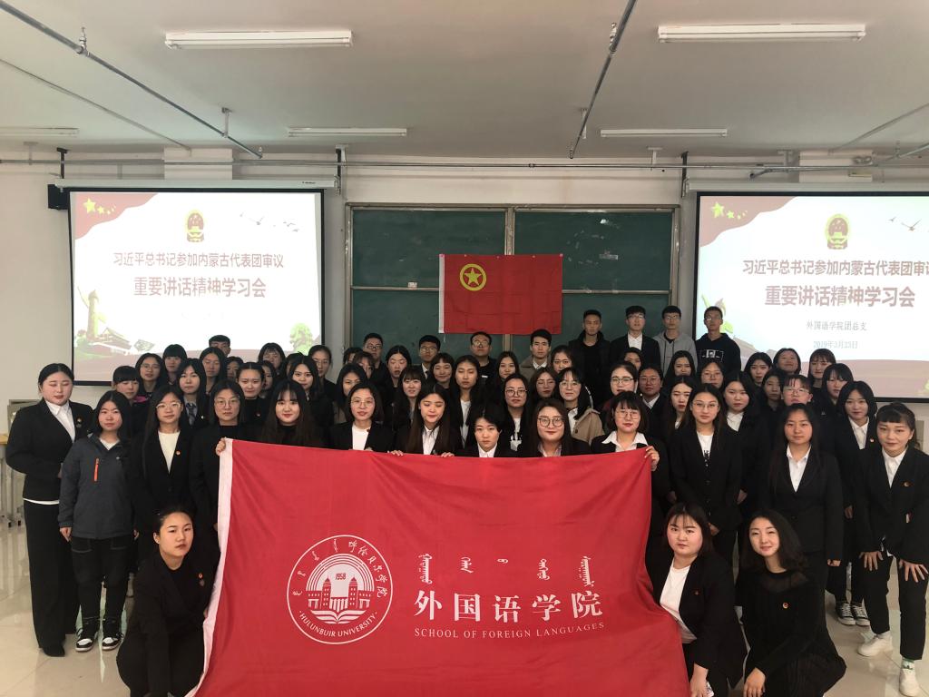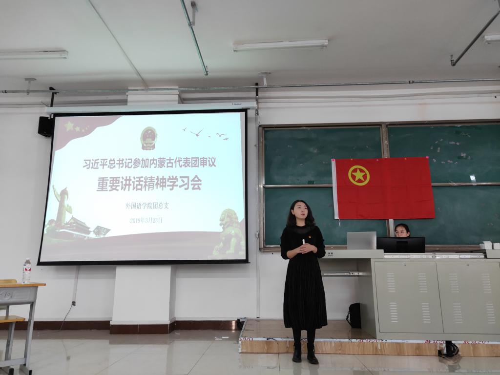 为深入学习贯彻领会习近平总书记参加十三届全国人大二次会议内蒙古代表团审议时的重要讲话精神,深入开展全团“青年大学习”行动,3月23日上午,外院团总支在崇文楼B-101举办了学习贯彻习近平总书记在参加内蒙古代表团审议重要讲话精神专题学习会,此次学习会由外院团总支书记王巍主讲,外院全体团干部、员工会干部100余人参加了此次会议。