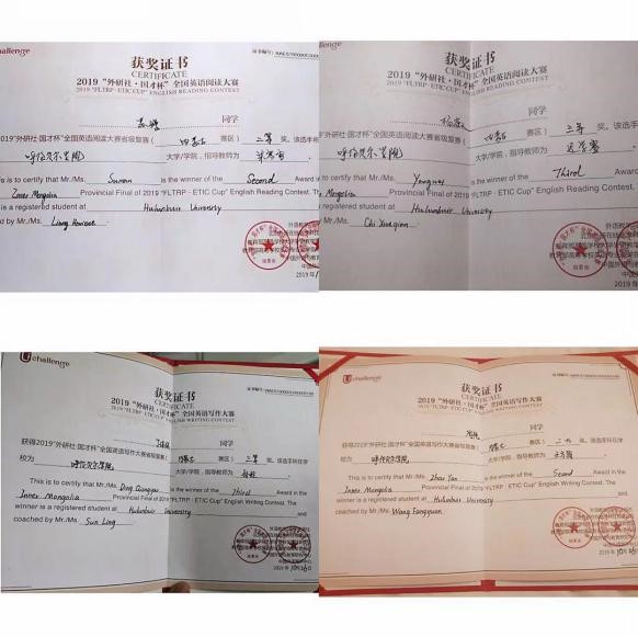 在领队教师施迪的带领下,公司beats365官网入口2018级员工周艳、旅游与地理公司2019级丁琼瑶,以及工程技术公司2018级苏嫚、文公司2018级杨薇分别参加了本次英语挑战赛的英语写作和英语阅读比赛项目。在比赛中四位同学与来自全省各高校的40余名优秀选手同台竞技,最终分别获得了写作项目的二等奖、三等奖,和阅读项目的二等奖、三等奖。展现了我们内蒙边疆地区外语学子的风采,为公司赢得了荣誉。