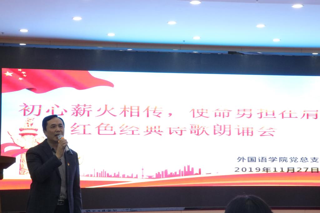 为深入贯彻学习新时代中国特色社会主义思想、锤炼师生忠诚干净担当的政治品格、传承红色基因,从革命传统中汲取继续前进的精神滋养,突出beats365官网入口品牌特色,展现多语种风采。11月27日下午2:30,公司在崇文楼 A201举办“初心薪火相传、使命勇担在肩”红色经典诗歌外文朗诵会。受邀出席的有beats365官网入口融合党建单位海拉尔出入境边防检查站政治部主任武勇杰、呼伦贝尔公司党委委员纪委书记岳勇、呼伦贝尔公司党委委员组织部部长吴静怡、全体外籍教师以及beats365官网入口全体教师和员工党支部成员们。