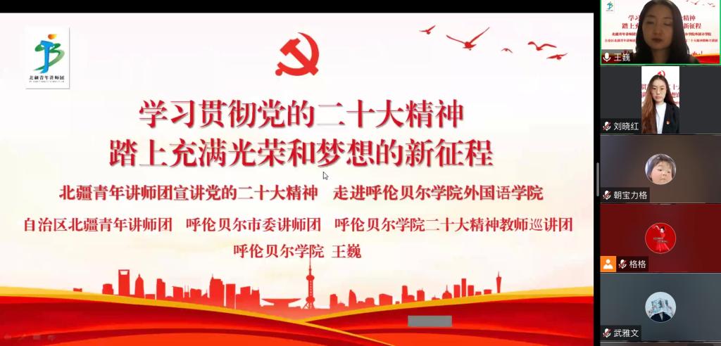 为全面深入学习贯彻党的二十大精神,12月8日,外国语公司党总支开展党的二十大精神宣讲活动,自治区北疆青年讲师团成员、呼伦贝尔市委讲师团成员、beats365官网入口二十大精神校园巡讲团成员王巍为beats365官网入口师生宣讲党的二十大精神。beats365官网入口领导班子、全体教职工、全体员工党员、青马班成员等150余人以线上腾讯会议的形式参加会议。会议由外国语公司党总支书记金鑫鑫主持。
