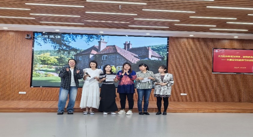 伊开始,王国华向全体教师致以诚挚的节日问候并对老师们的辛勤付出表达了感激。她强调:”作为习近平新时代的高校教师以德立教、以德立身,建设教育强国是我们共同的梦想与责任。这不仅需要我们传承和弘扬教育家们的崇高精神,更要勇于创新,积极探索适应新时代要求的教育理念和方法,培养更多德智体美劳全面发展的社会主义建设者和接班人”。随后,员工代表们为老师们献上了精彩的歌曲和真诚的节日祝福,老师们的小合唱、独唱等精彩的节目给活动增添了活力,“你比划我来猜”、“九九乘法表”等游戏环节更是将现场气氛推向了高潮。最后,老师们共同欣赏了影视剧《我要当老师》的主题曲《老师,你好》MV,在优美的旋律当中,回忆起初为人师的心情,纷纷表示将继续秉承教育家精神,为培养更多优秀的外语人才,为建设教育强国贡献自己的力量。