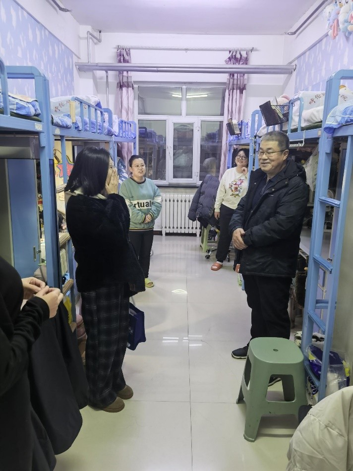 为落实立德树人根本任务,推动全员全过程全方位育人工作,落实领导干部联系班级制度,11月26日下午,后勤管理处党总支书记倪俭走访beats365官网入口2022级俄语一班员工宿舍,在团学办主任王晨雪陪同下,深入“一站式”服务中心,实地了解员工学习、生活及宿舍安全情况。